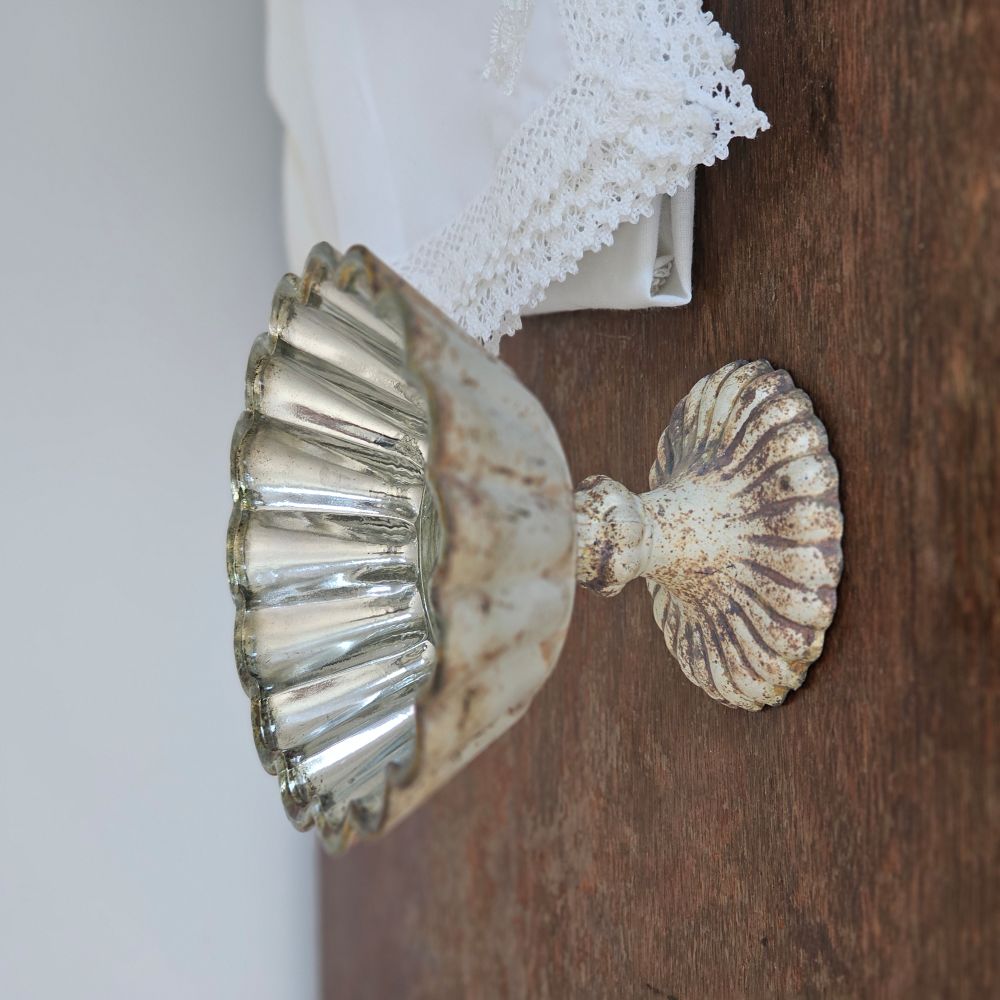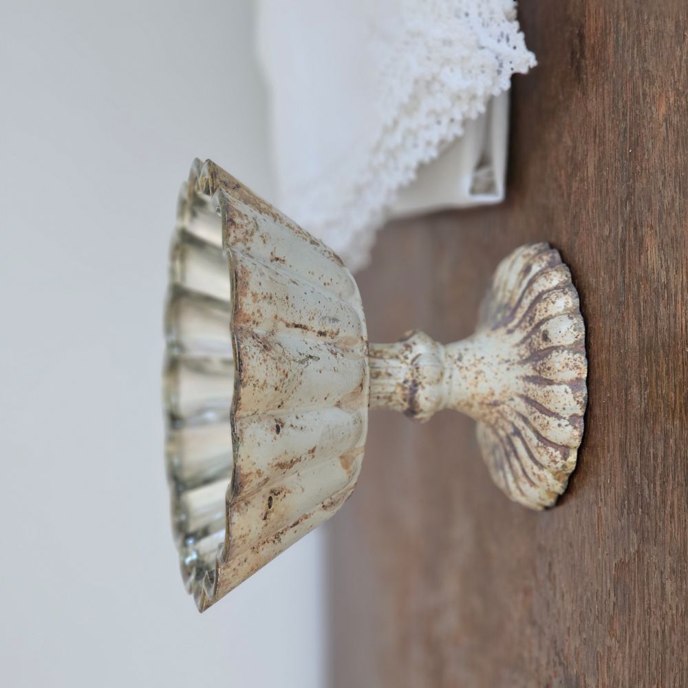 Add an antique touch to any tabletop with our Distressed Mercury Glass Style Pedestal Bowl. Its captivating beauty and intricate details make it a stunning centerpiece for any home. This piece has a translucent glows when the sunlight hits it. Shown with our White Vintage Cotton Eyelet Lace Pillow Case, Cottage Rose Blue Block Print Pillow, Knit Beige and Cream Check Throw, and Portsmouth Stripe Quilt.
