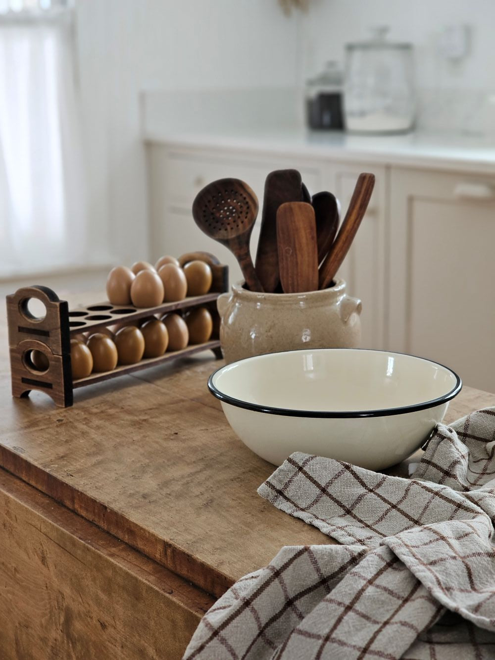 Inspired by antique egg holders, such as ones spotted in the Downton Abbey kitchen, our farmhouse Rustic Wood Stackable Egg Tray will be right at home in your kitchen. It is sold as one tray, and a purchase of two gives you that old-timey stackable look. Makes a great accent for any shelf or countertop. Each rustic wood egg crate holds 12 eggs. Eggs not included. Includes one tray. Purchase two or more for stacking. Made in the USA. 12"L x 3"W x 3.5"H