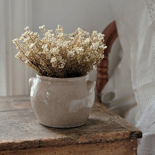 Add sweet spring charm with our Potted Light Pink Grape Hyacinth Flowers. These meticulously crafted faux blooms showcase soft pink petals and delicate green foliage, capturing the refined beauty this iconic flower. The light gray ceramic pot complements any interior aesthetic, while its compact design allows for seamless integration into existing arrangements, baskets, or display shelves. A timeless accent that delivers year-round freshness without maintenance. French Style Stoneware Confit Crock sold separately. 4" Diam x 11"H