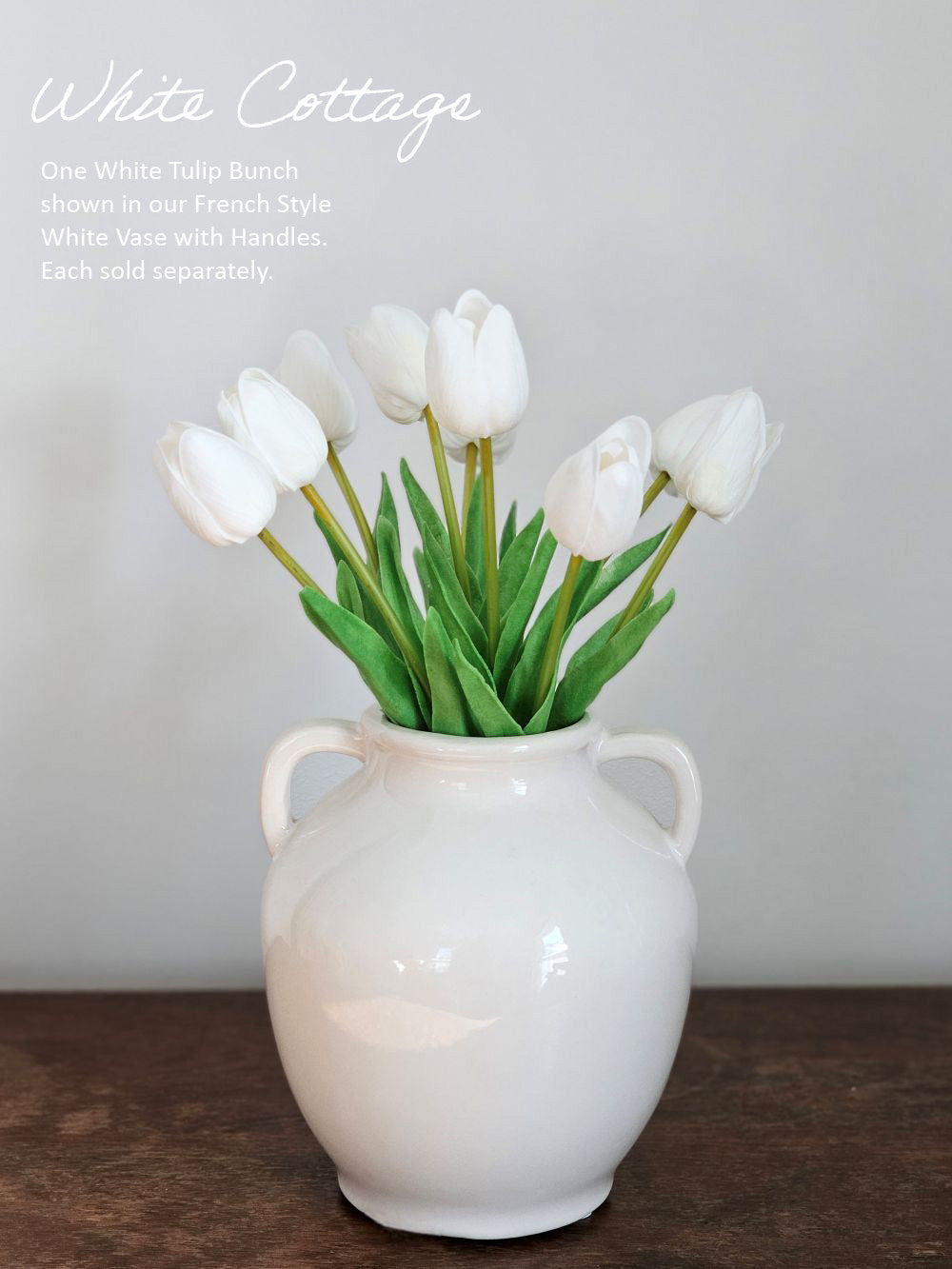 Add a cheerful touch of spring to your home with this sweet White Tulip Bunch. Each bouquet features nine lushly layered tulips with real-touch quality petals and fresh green foliage. The tulip flowers stand 14 inches tall and have a lifelike beauty. These faux florals will inspire lots of great ideas for any home stylist looking for natural accents without a lot of maintenance. One bunch includes nine stems tied with natural raffia. 14” H