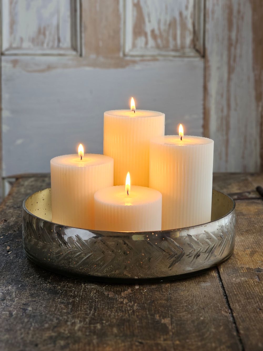 I wove red velvet ribbon through our French Wire Trivet Style Candle Holder to create a festive feel. I added apples with candles along with some greens to complete the look. Candle, ribbon and roses not included.