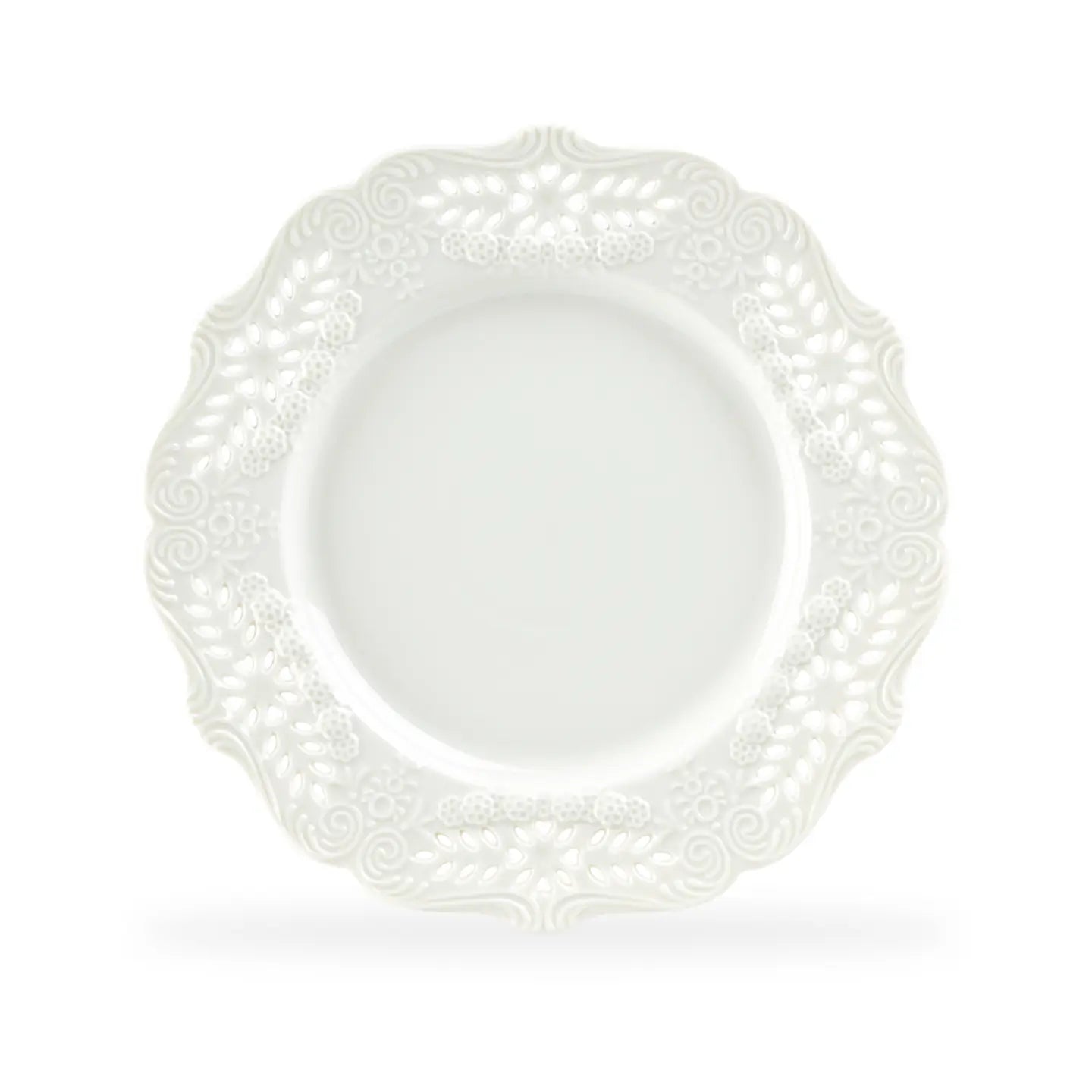 This creamy white porcelain dinner plate marries vintage charm with refined elegance. Featuring hand-detailed embossed flowers and delicate cutout lace work, the gracefully scalloped edge evokes timeless sophistication. Whether gracing your everyday table or reserved for special gatherings, this single plate serves as a subtle statement of cultivated taste and enduring style. Food safe. Microwave safe. Hand wash recommended. Each sold separately. 10" Diam