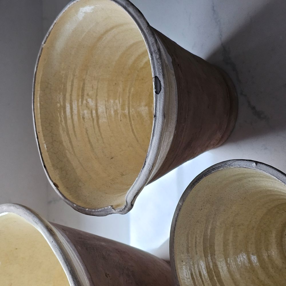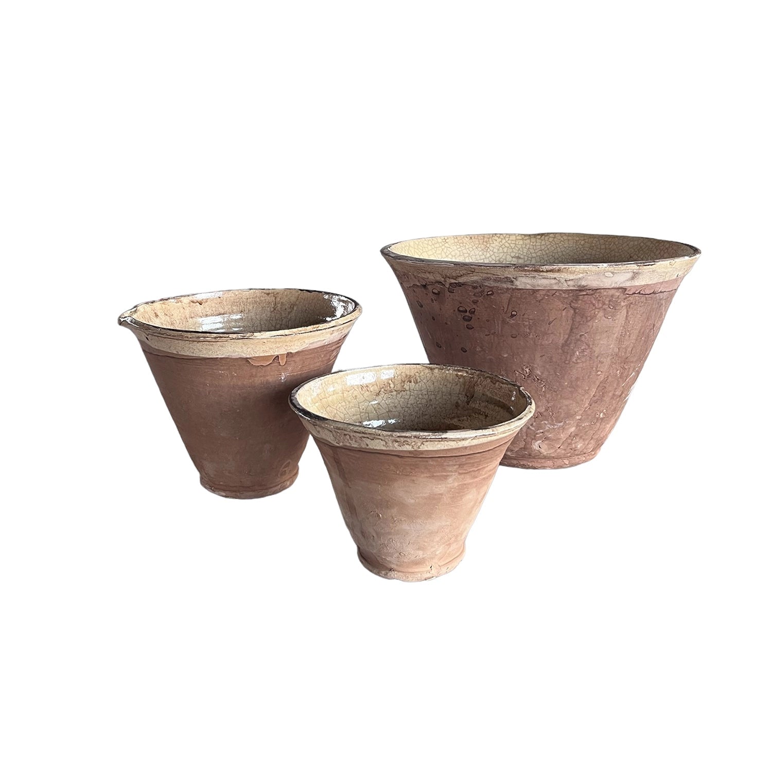 Since the time of the Ancient Greeks, handmade pottery has been a hallmark in southern European farmhouses and beyond. Travel through the Mediterranean regions, and there is no doubt that you will find a bevy of clay dishware. Retaining the rustic, handmade appeal of daily wares, these Rustic Farmhouse Clay Bowls, in three sizes, have a deep, conical shaped basin. The exterior remains a natural clay while the interior and upper lip of the bowl is glazed with a crackled, imperfect buttercream finish. Set of three: Small 7” dia x 5” Medium 8” dia x 6” Large 11½” dia x 8”