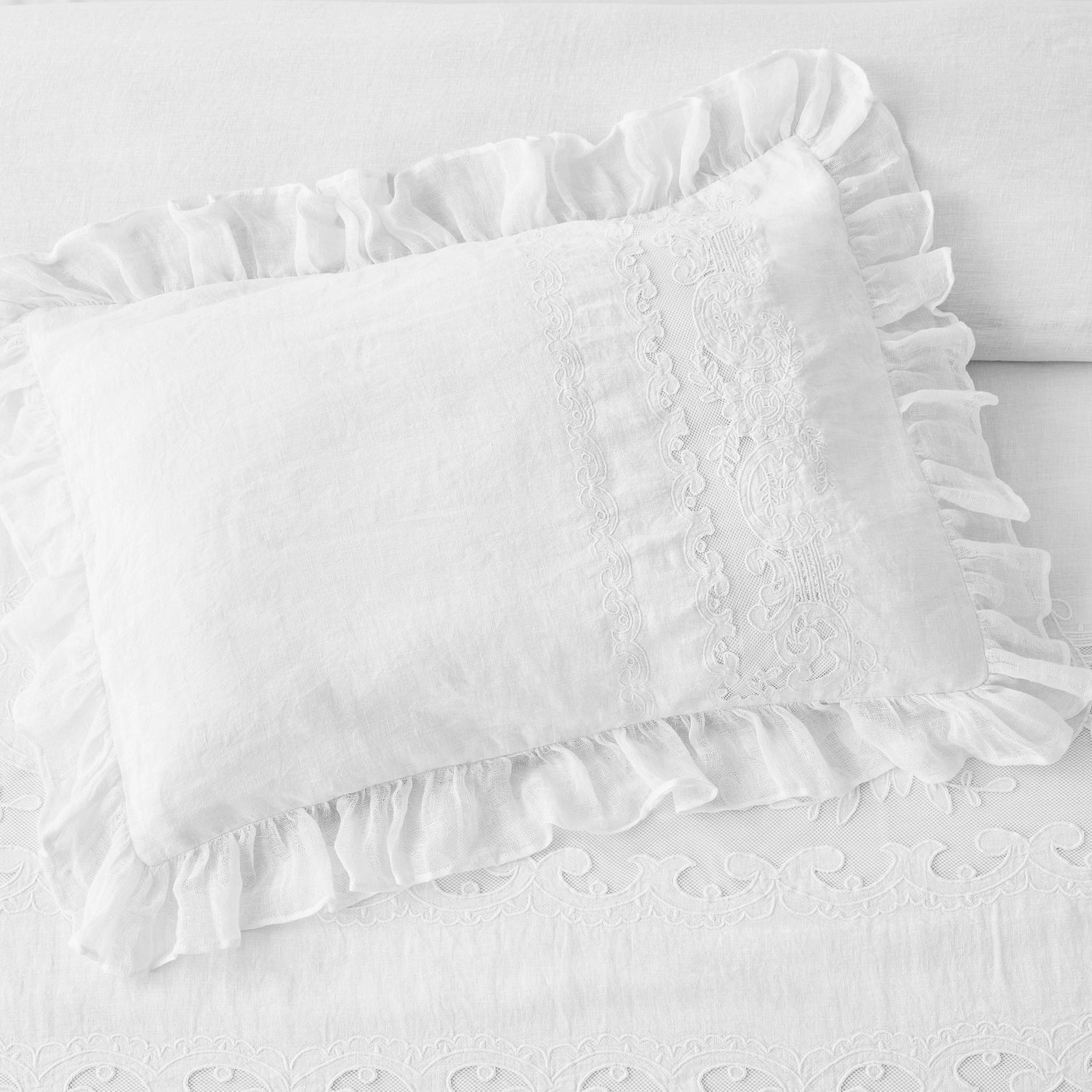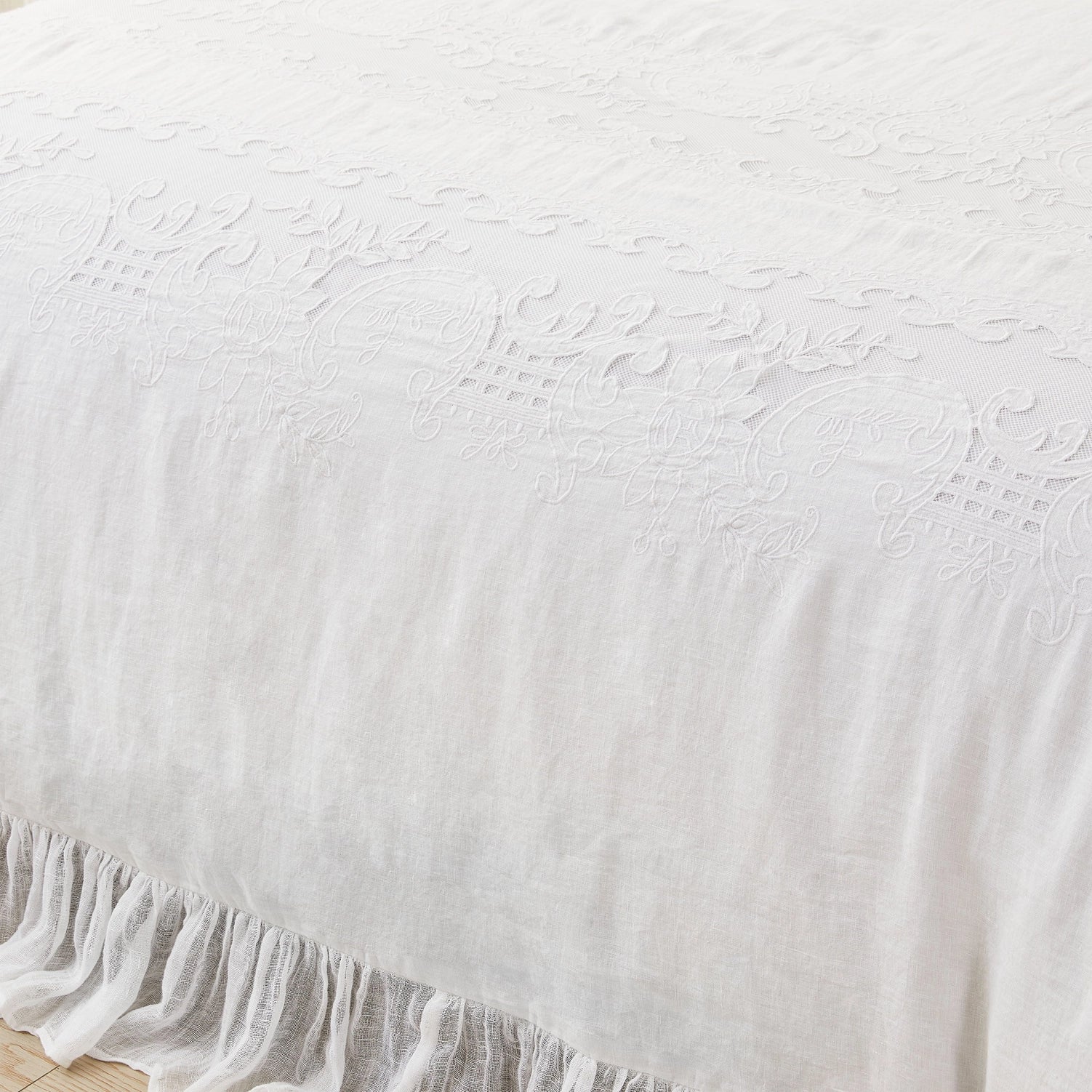 Our White Linen Duvet Cover and Sham Set is shabby chic cottage elegance at its finest. Handcrafted with a linen applique overlay, crochet and pleat detailing, and a sheer voile ruffle border, this duvet set is simply incredible. Linen is breathable, durable and softens with every wash.