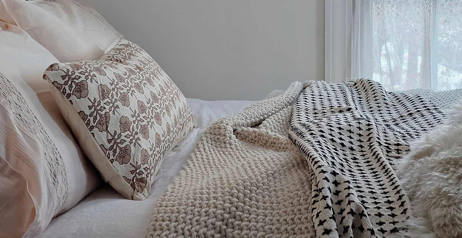 Our White Chunky Knit Throw is paired with our White Cable Knit Pillow and Cloud White Ruffle Pillowcases for a vintage cottage look. Our White Star Candle Holder adds magical ambiance for cold winter nights.