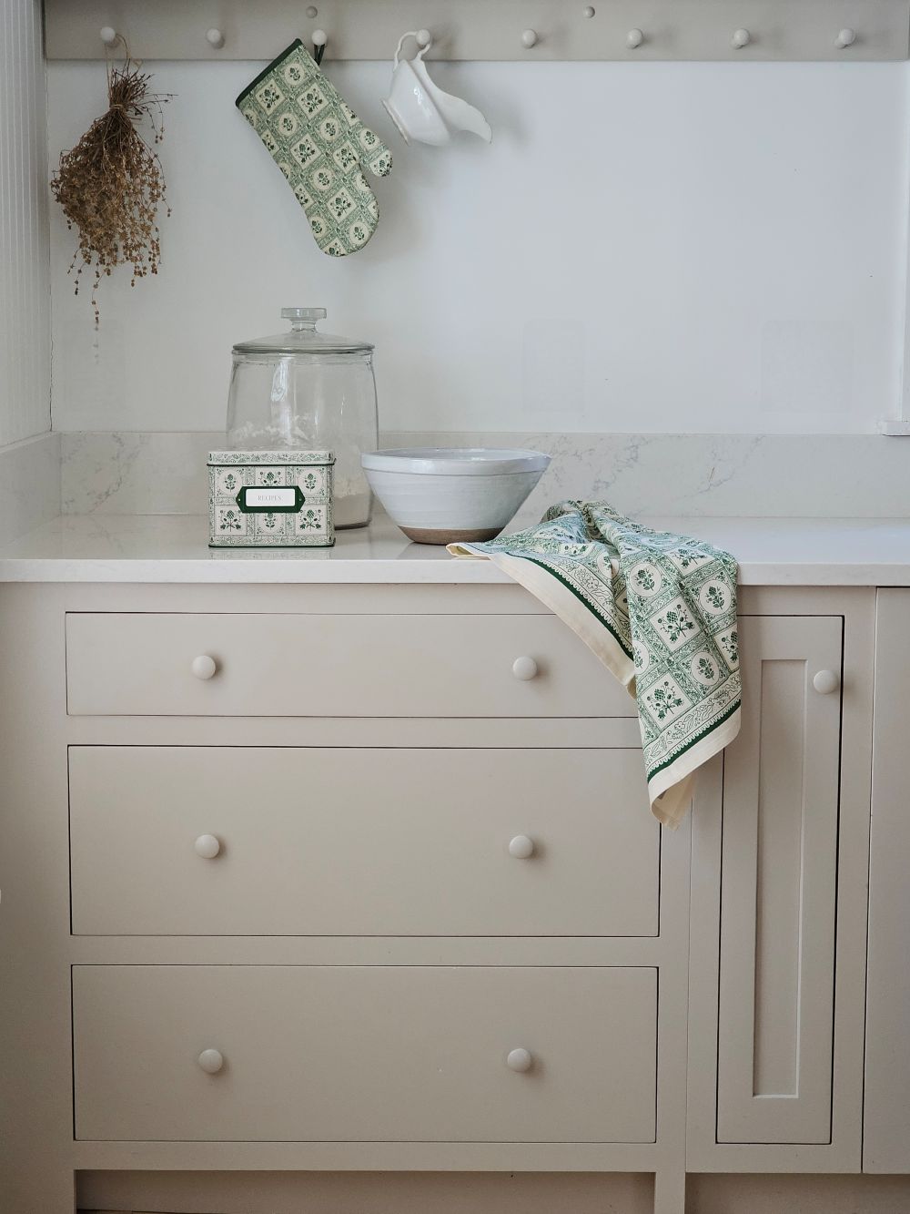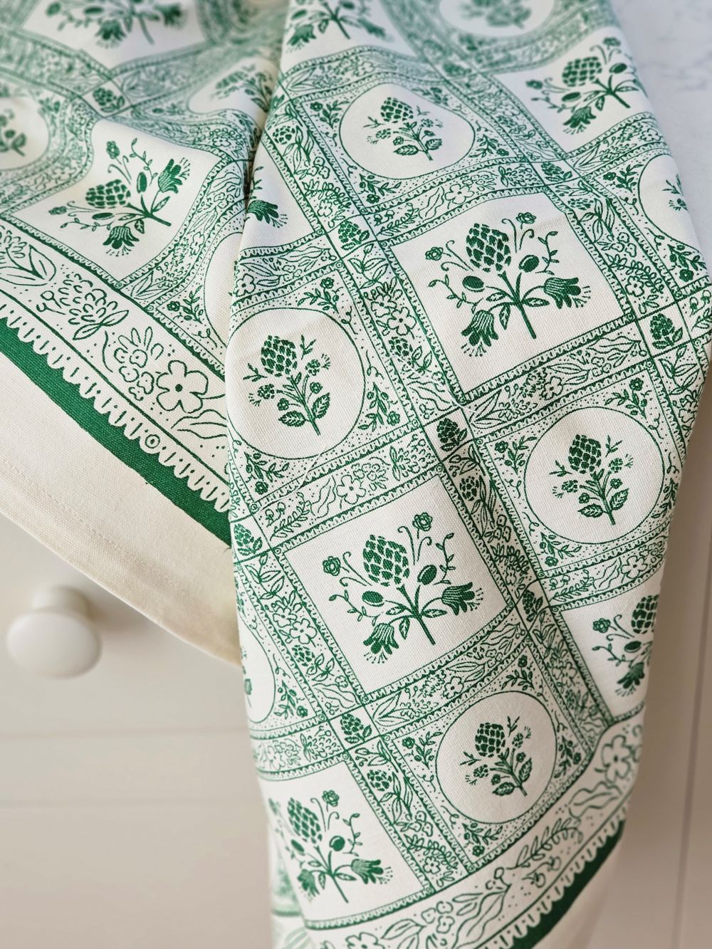 The Artichoke Tea Towel brings cottage style charm to your kitchen with its vintage green artichoke design set against a creamy ivory background. Crafted from 100% cotton, this multi-functional towel is ideal for lining bread baskets, drying dishes, or enhancing your kitchen’s decor. A discreet corner loop ensures effortless hanging and accessibility. 21.25" x 28.5"