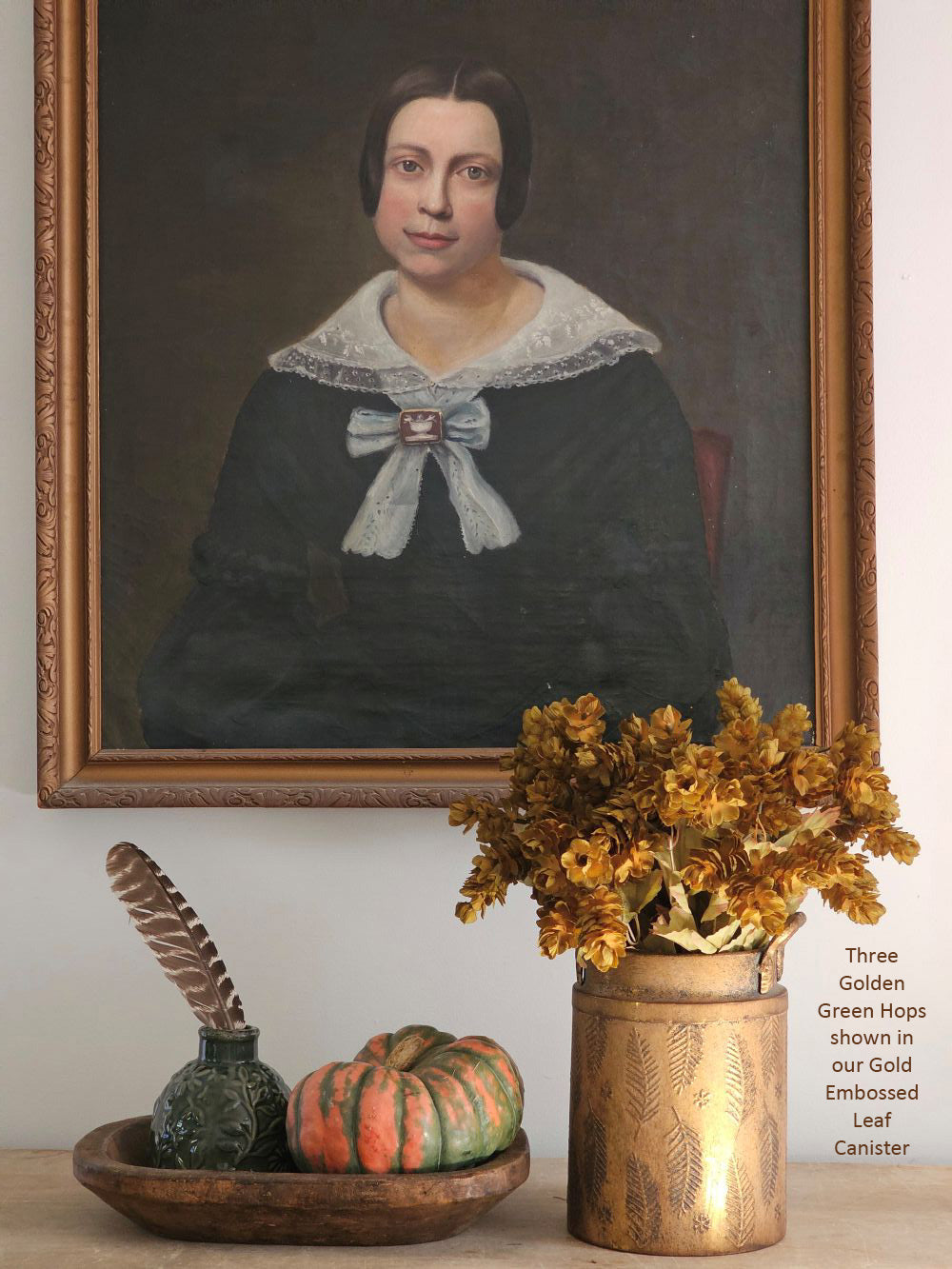 Let fall's warm vibrancy fill your farmhouse with this Golden Green Hops Bush. This faux floral pick is lush and packed with aged hops blossoms, making it an easy choice to fill any basket or vase. It features golden, green and brownish hues for an authentic faded appearance. The wire stems make it easy to shape to fit any vase or basket. Each pick is approximately 14”H.