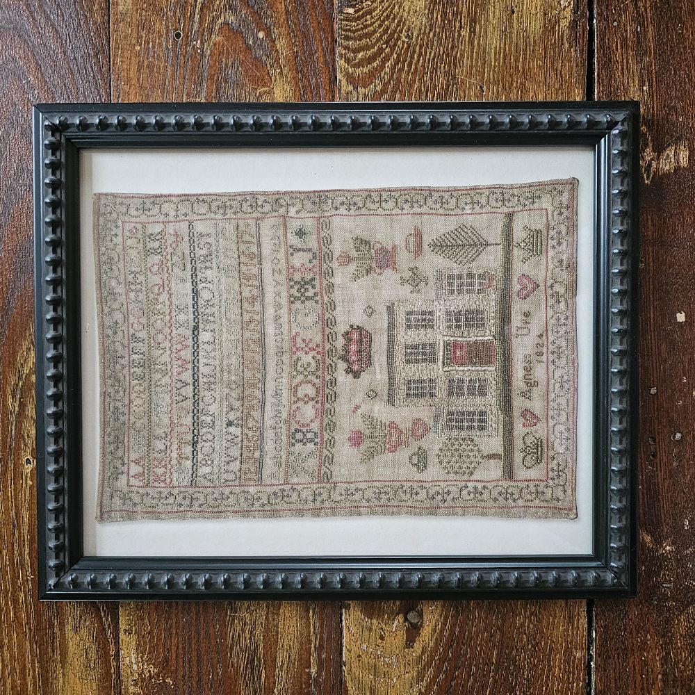 This Antique Sampler Reproduction Print with Black Beaded Frame exudes vintage charm and early American style. The original sampler dated back to 1824 and has a beautiful tea stained look. The black frame has an aged look with beaded detailing, making it look like an antique shop find. Includes glass to protect the print for years to come. Please note: this is a print and not a real fabric sampler. Made in the USA. 9.75"L x 11.75"H