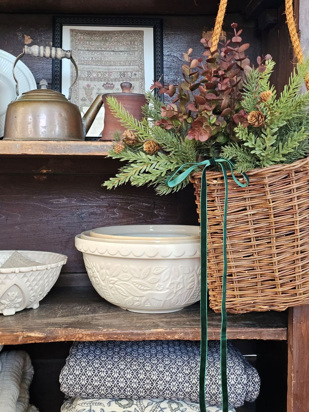 I wove red velvet ribbon through our French Wire Trivet Style Candle Holder to create a festive feel. I added apples with candles along with some greens to complete the look. Ribbon not included.
