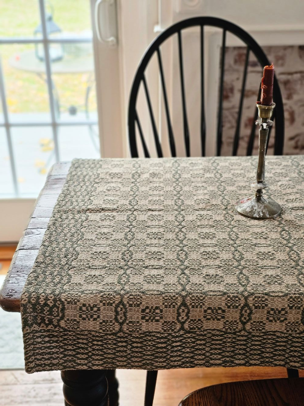 Influenced by vintage Welsh tapestry patterns, the Welsh Inspired Table Square with Green and Flax Design adds instant old-world charm to any room. An ornate geometric pattern adorns the table square, along with a contrasting patterned border. Table squares are perfect for protecting wood tables or even larger tablecloths. They're great for adding a bit of warmth and character to smaller tables. They are made from premium cotton and is machine washable for simple upkeep. Table squares are perfect for dressing up a table and lending a pop of color to a room. Measures 34" high by 34" wide.