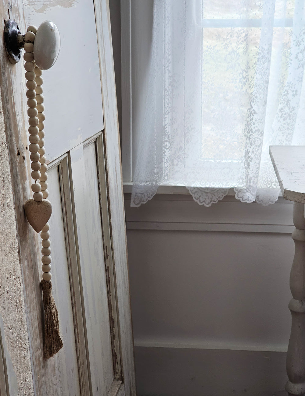 This Wood Bead Rope with Carved Heart adds texture and style to hooks and shelves. This hanging heart features natural wood beads and a simple small, natural wood heart and a twine tassel. Perfect for wood and white farmhouse decor. 1.5" W x 26"H