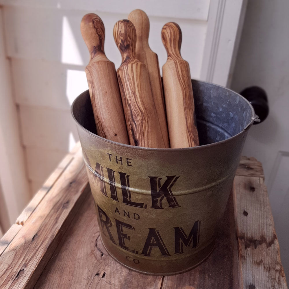 Whether you're gathering flowers from the garden, eggs from the chicken coop, or keeping your home organized, this set of two Milk and Cream Buckets will help get the job done. These galvanized buckets feature a rustic golden finish and vintage style wood handle grips. Perfect for utensils, flowers and so much more!