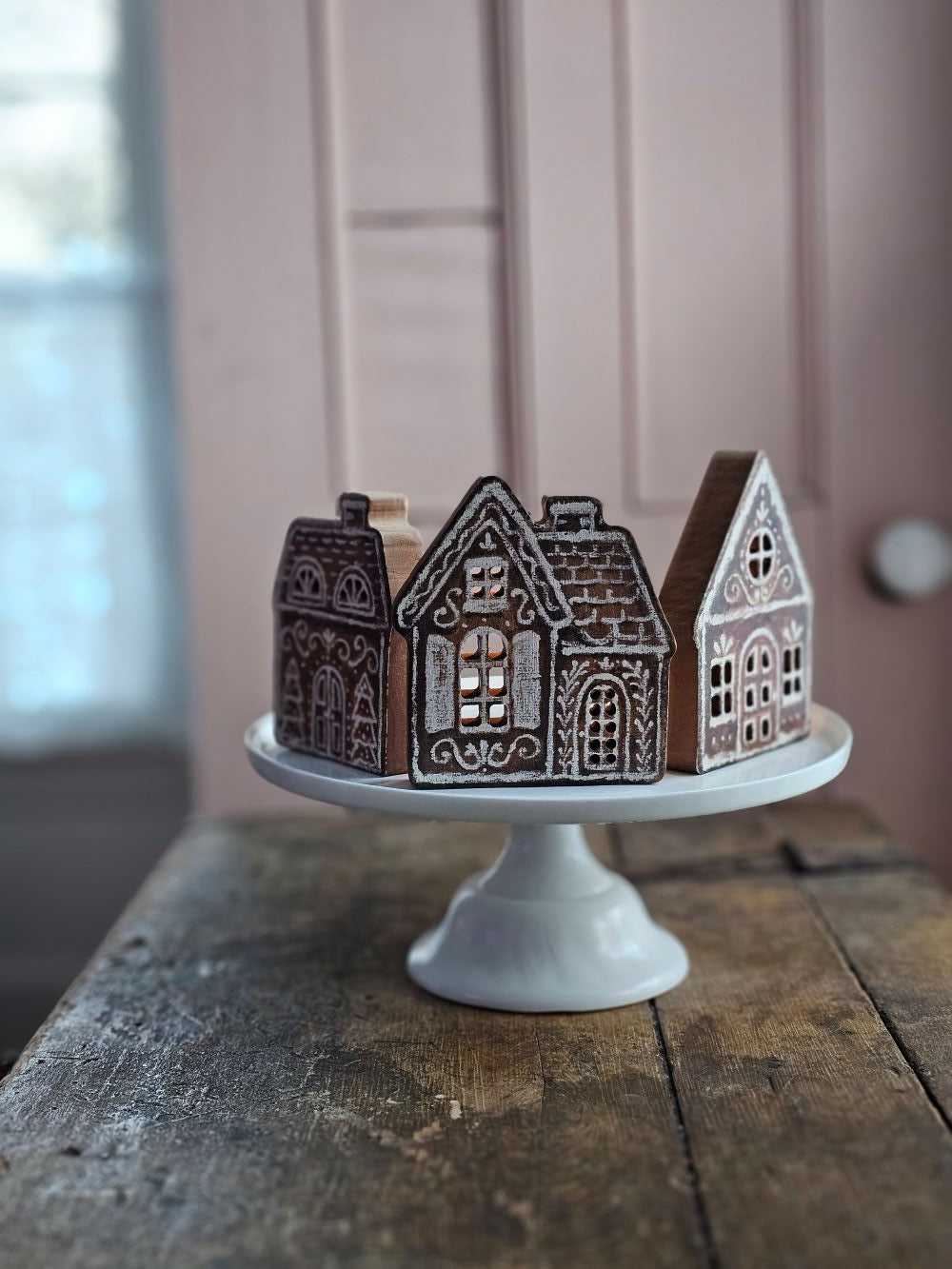 Our Gingerbread Village Shelf Sitter Set features three wooden houses with gingerbread inspired designs. Gingerbread house designs are replicated from original artwork painted onto burlap canvas, giving the art a unique depth and texture. Each house features cutout designs for the windows with coordinating natural wood on sides and backs. Create a warm glow in the cutout windows by placing a battery operated tealight behind each one (not included.) Our Gingerbread Village chunky sitter set is designed to free-stand alone on flat surface. Dimensions: 3.3"L x .5"W x 5.8"H