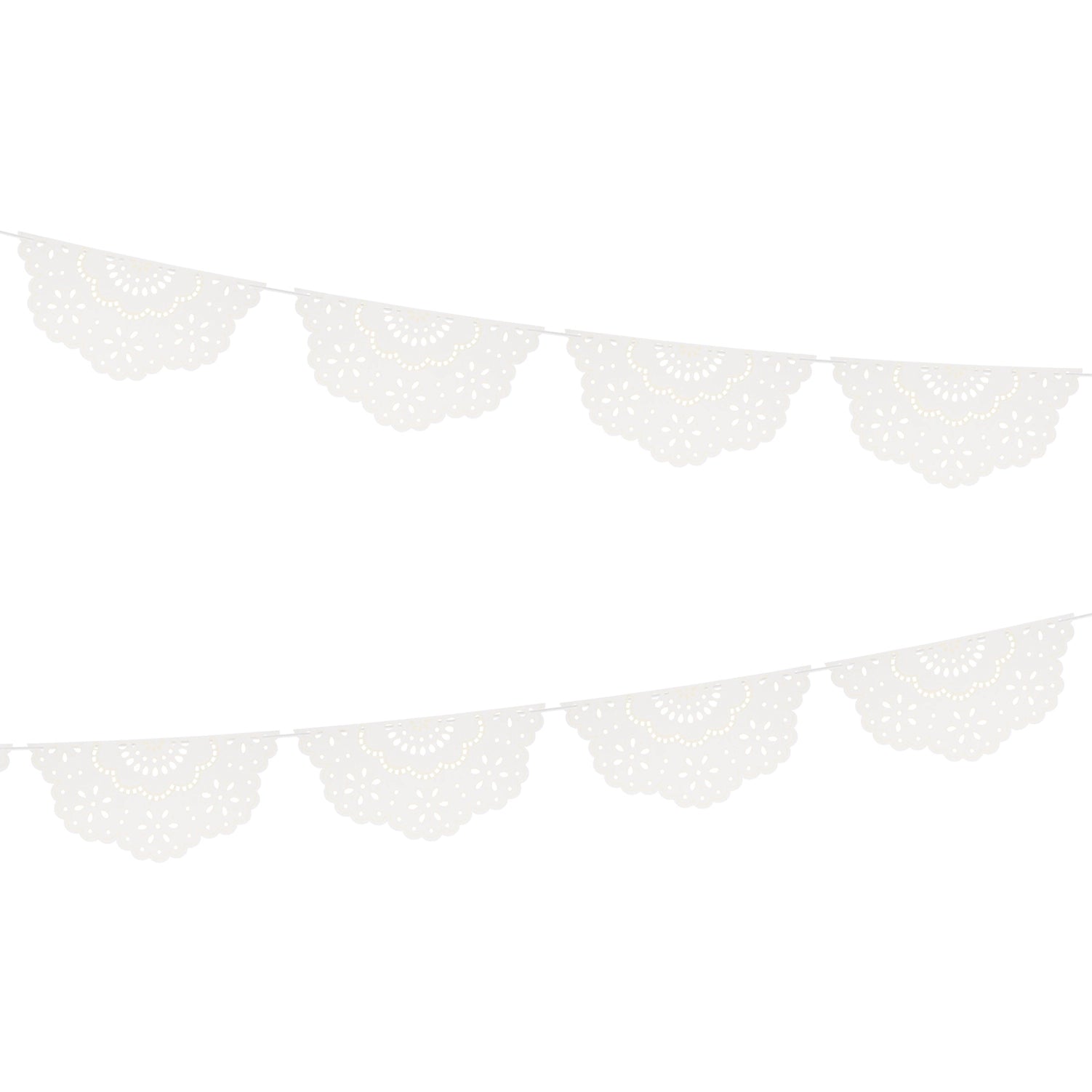 Add a sweet vintage touch with this refined Paper Lace Doily Style Pennant Garland, showcasing delicate scalloped pennants in pristine white adorned with embossed ivory accents. Suspended from an ivory velvet ribbon, this 9-foot garland extends to 13 feet with cord, making it ideal for creating an elegant backdrop at bridal showers and celebrations. Perfect for infusing English cottage sophistication into bedrooms, mantels, and living spaces, this piece brings timeless charm and understated luxury to any room.