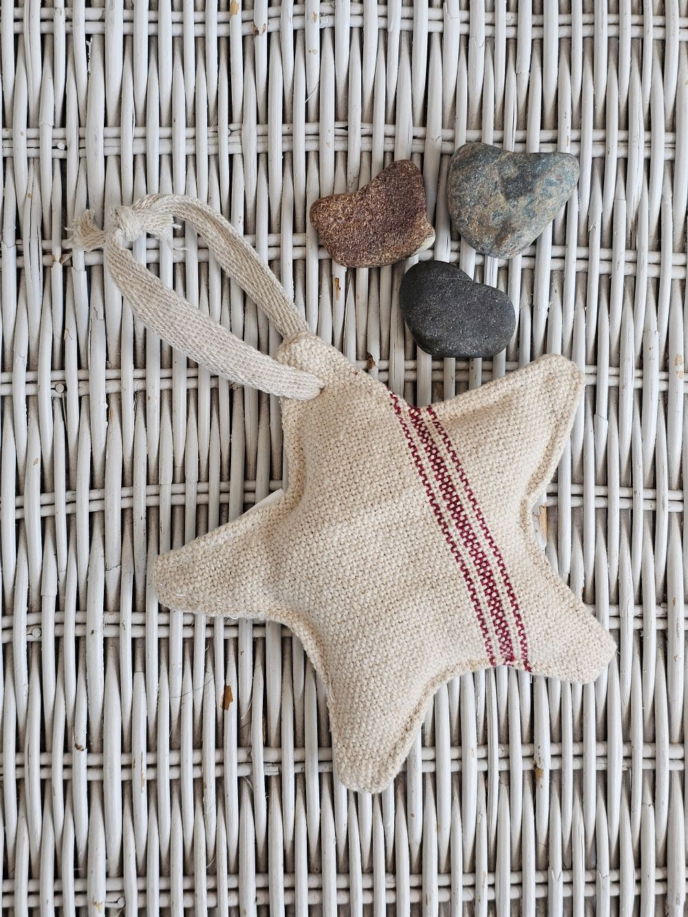 Our Red Stripe Grain Sack Star Ornament looks so charming whether you're Christmas style is French Country, Vintage Farmhouse, or classic Nordic style. This fabric star ornament offers an old-fashioned look, inspired by French grain sacks. 100% Cotton. 5.25" Diam