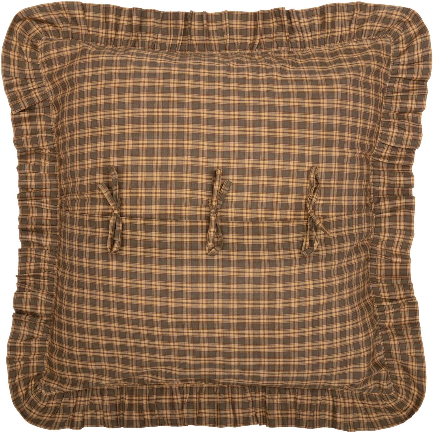 Bring understated elegance to your home with the Woodland Cottage Plaid Euro Sham. This 26x26-inch accent piece showcases a refined tartan plaid in nature-inspired hues—olive green, deep reddish-brown, and warm tan—creating a sophisticated yet relaxed aesthetic. The muted color palette and traditional pattern work beautifully on beds, sofas, or accent chairs, lending timeless woodland cottage charm to any room. Convenient bow-style closures allow for effortless removal, while the ruffled edge adds classic country character. Machine washable and iron safe for easy care. Pillow insert not included. Includes: 1 x Euro Sham. Care Instructions: Machine Wash, Line Dry, Iron Safe. Material: 100% Cotton. 26" x 26"