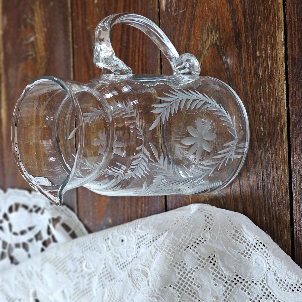 Bring timeless elegance to your table with this hand-blown glass pitcher, crafted in the French Country style. Delicate etched design on both sides, creating a sophisticated vintage aesthetic that complements both traditional and eclectic decor. Standing 7.25 inches tall with a 3-inch diameter base, this pitcher holds 36 fluid ounces—perfect for serving water, wine, or fresh-squeezed juice at dinner parties or everyday gatherings. The hand-blown construction ensures each piece is beautifully unique, with subtle variations that add to its artisanal charm. Ideal for farmhouse kitchens, cottage-style entertaining, or as a meaningful gift for those who appreciate quality glassware. 3"Diam x 7.25"H