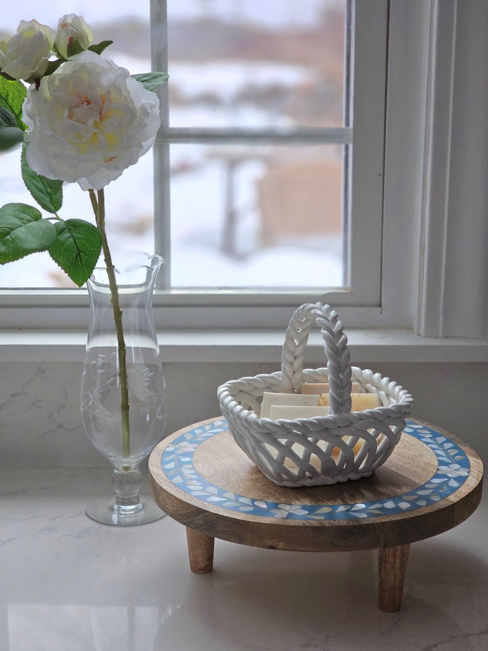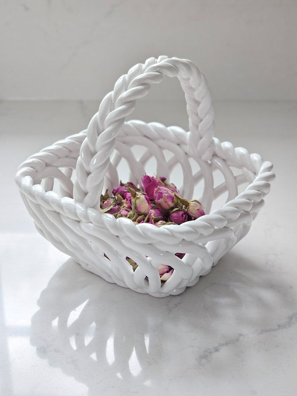 Bring cottage charm to any room with this elegant white woven porcelain basket. Crafted with a delicate lattice pattern, it captures the warmth of traditional cottage style. Perfect for displaying Easter eggs, guest soaps, potpourri, or seasonal decor, this versatile piece adds character to shelves, tables, and entryways. Its timeless design complements French Country, vintage, and classic interiors beautifully. Dishwasher safe. 5.7" x 5.5" x 6"H