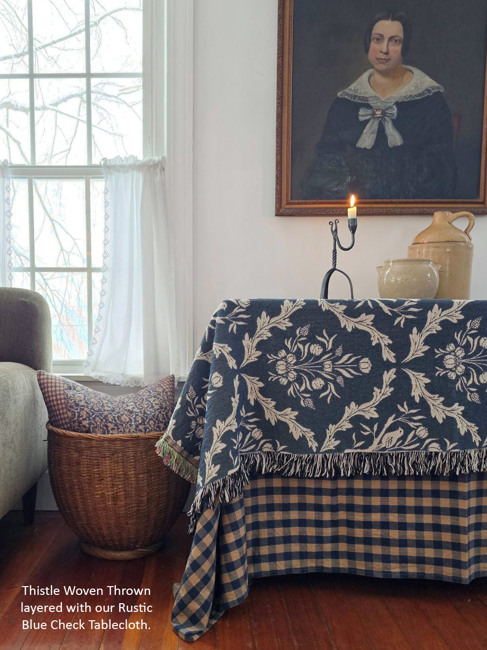 The Rustic Blue Check Tablecloth offers a versatile design choice for any farmhouse. The bold blue and rustic tan buffalo check design create a combination that works with so many decor styles. Whether it's French Country, English cottage or rustic farmhouse, this accent adds a charming touch. 100% Cotton. Machine wash cold. Line dry. Available in two sizes. Select size in menu 70” Round, 60" x 102"