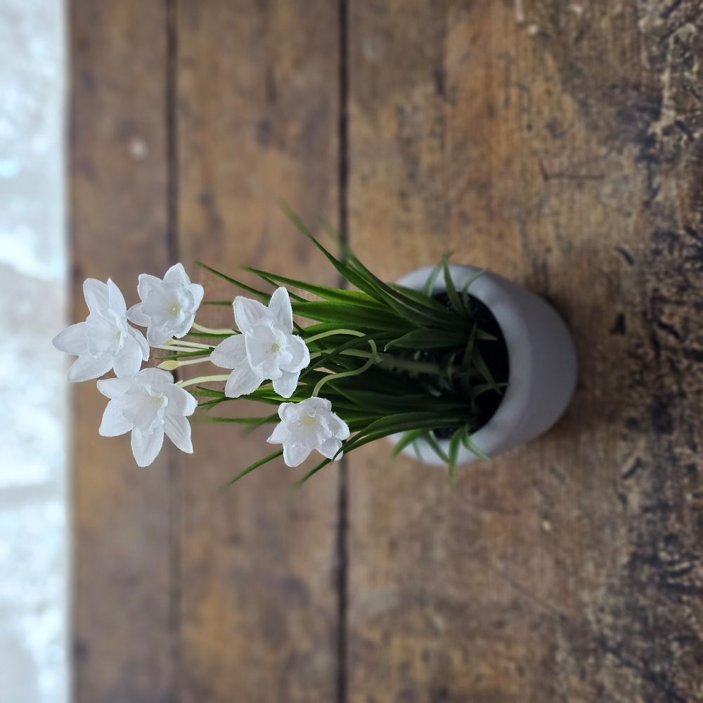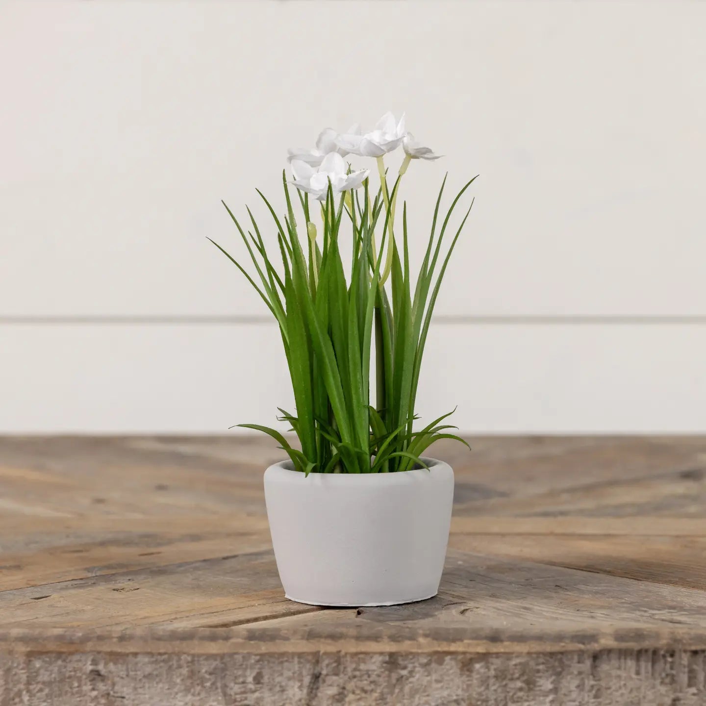 Bring understated elegance to your decor with our Potted White Daffodils. These meticulously crafted faux narcissus blooms showcase pristine white petals and delicate green foliage, capturing the refined beauty this iconic flower. The light gray ceramic pot complements any interior aesthetic, while its compact design allows for seamless integration into existing arrangements, baskets, or display shelves. A timeless accent that delivers year-round freshness without maintenance. 3" Diam x 8"H