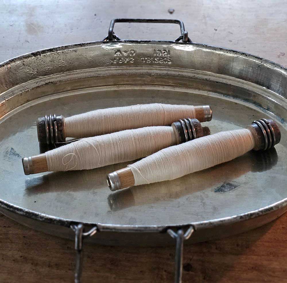 Bring a little history into your farmhouse with these Vintage Style Textile Bobbins. This set of three antique wood thread spools from England date back to the early 1900’s. The wood colors vary and no two are alike. These authentic antiques have rich wood colors with metal tips that have a perfectly aged patina and include white thread. This set is great for adding a rustic accent to any tabletop.  Each is. 6.5" long and 1.5” in diam. Set of three.