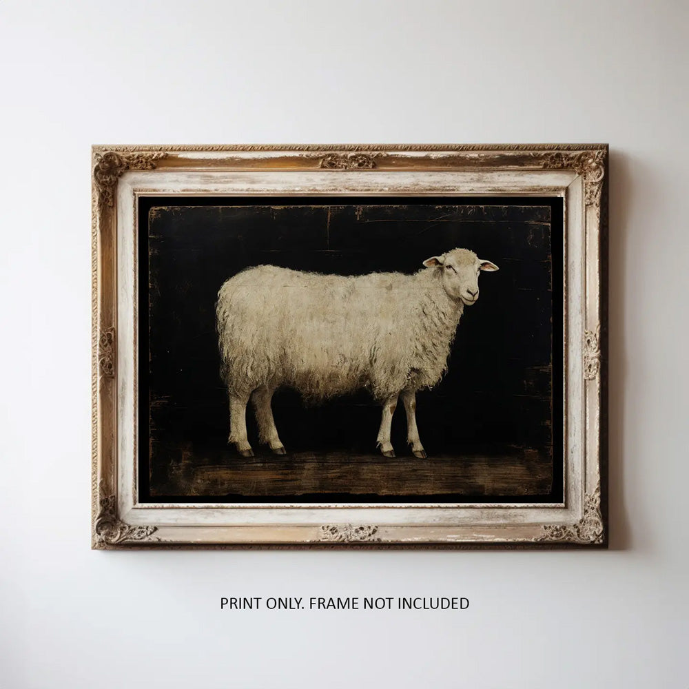 This beautiful art print features a white sheep on a moody, dark background. This vintage reproduction print that lends an antique charm to any room. It is printed on high quality card stock with archival ink. Original art has been digitally retouched to preserve characteristics, grain and cracks. Image size: 10"L x 8"H. Frame not included.