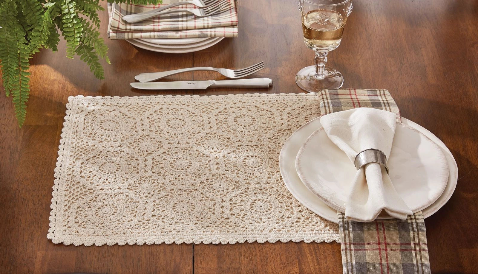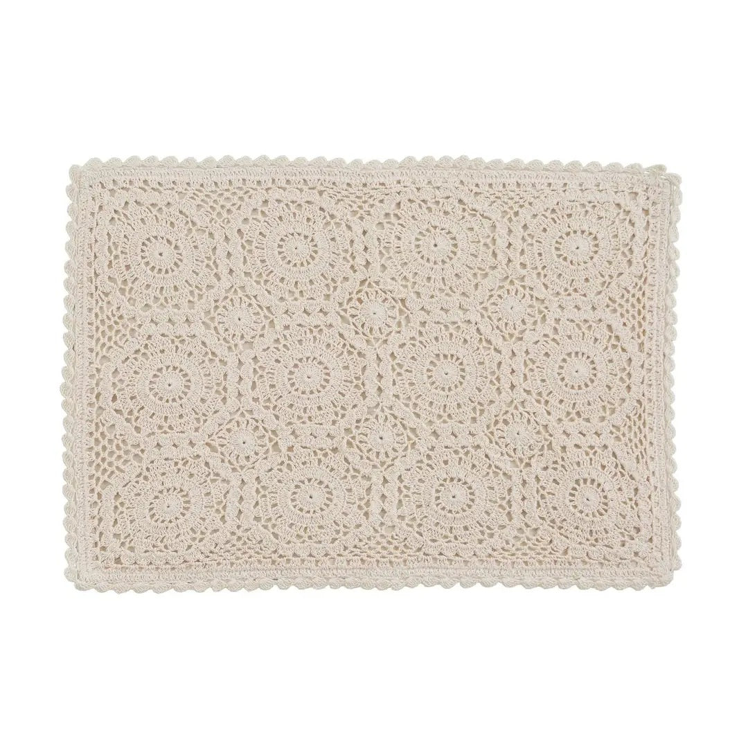 The Crochet Lace Cream Placemats showcase intricate crochet detailing that elevates any dining experience. Constructed from cotton, they offer both refined aesthetics and practical durability for everyday use. The delicate lacework brings timeless elegance to your table while remaining simple to care for, making them an ideal choice for those who appreciate quality craftsmanship and understated sophistication. Dry clean. Set of 2 Placemats 13" x 19"