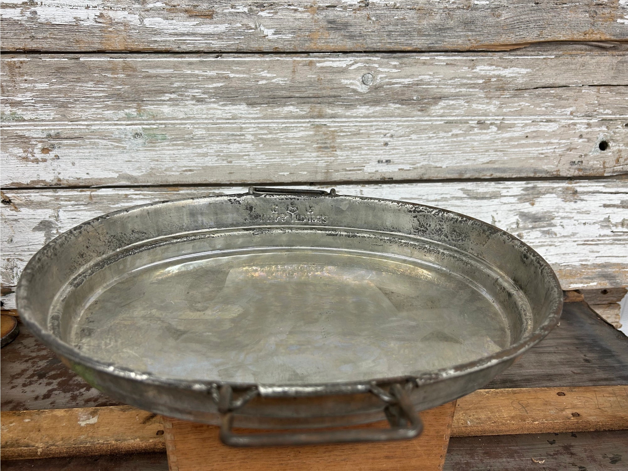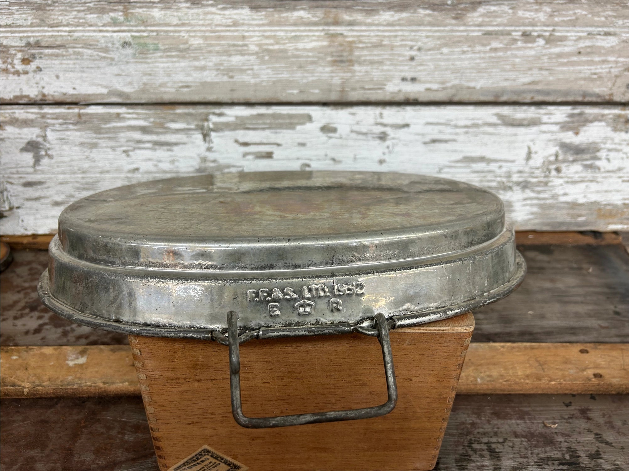 This authentic military-issue metal cookware lid carries the distinguished patina of mid-century British service, having seen active use during campaigns spanning 1940s to 1960s. The Old British Cook Pot Lids were used as brazing dishes over open fires. Each piece bears its own character—subtle wear marks, weathered finishes, and occasional date stamps—making every example genuinely unique. A conversation-starting accent for collectors and history enthusiasts who appreciate functional artifacts with genuine provenance and timeworn elegance. 14"L x 10"W x 2"H