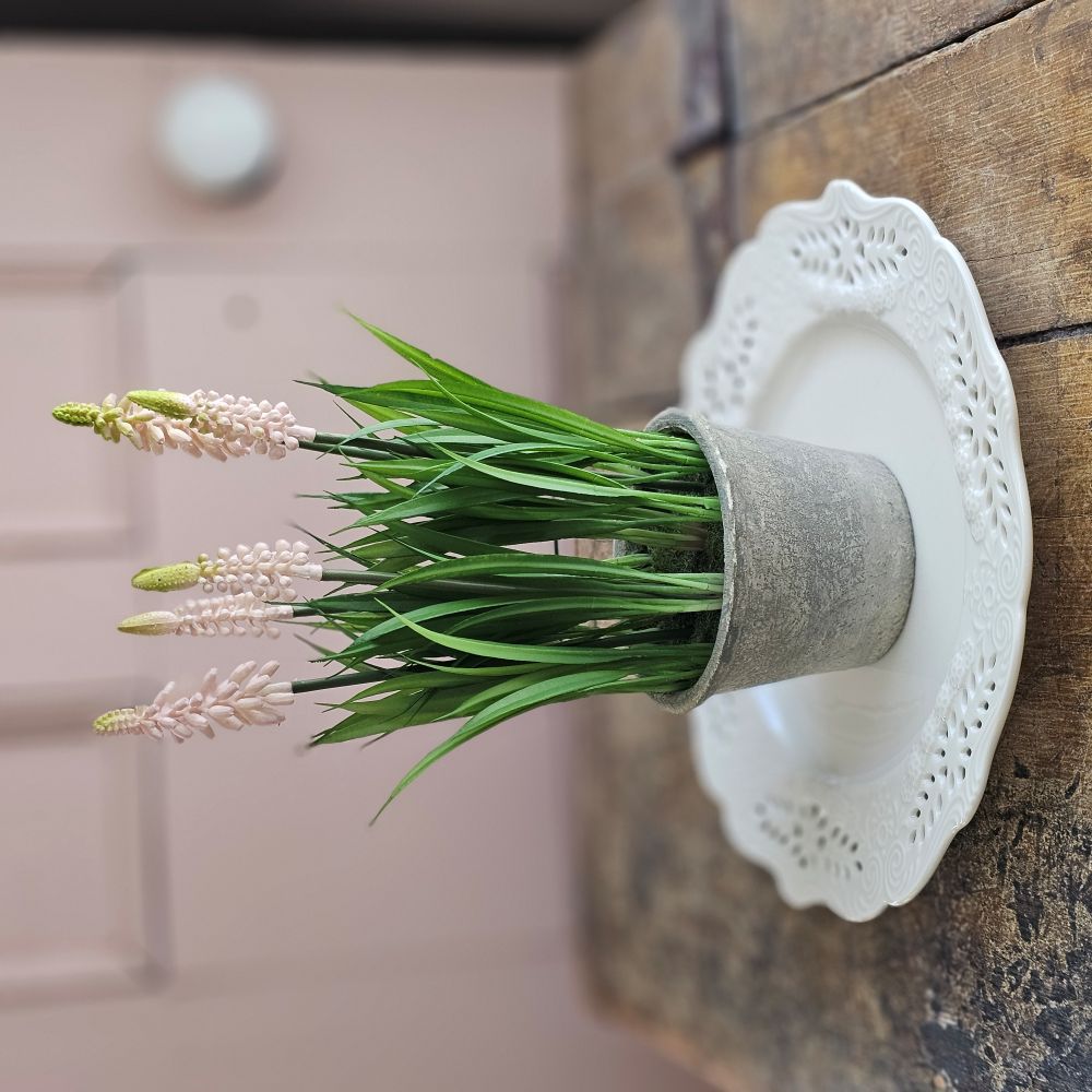 Add sweet spring charm with our Potted Light Pink Grape Hyacinth Flowers. These meticulously crafted faux blooms showcase soft pink petals and delicate green foliage, capturing the refined beauty this iconic flower. The light gray ceramic pot complements any interior aesthetic, while its compact design allows for seamless integration into existing arrangements, baskets, or display shelves. A timeless accent that delivers year-round freshness without maintenance. French Style Stoneware Confit Crock sold separately. 4" Diam x 11"H