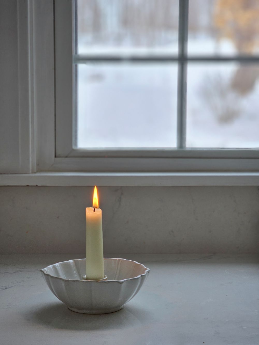 Crafted from ceramic with a refined white glaze, the White Lotus Ceramic Taper Candle Bowl marries contemporary minimalism with artisanal charm. The delicate lotus motif evokes natural grace while maintaining a clean, understated aesthetic. Perfect for creating a serene focal point in any space, it accommodates standard taper candles and invites a moment of calm into your home. Candle not included. 5.5" diam x 2"H